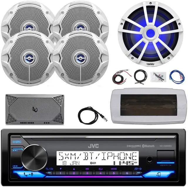 PACKAGE BUNDLE INCLUDES: JVC KD-X38MBS Single-DIN Marine Bluetooth USB/AUX LED Illumination AM/FM Radio SiriusXM Ready Stereo Receiver W/White Boat Stereo Splash Cover, 4x JBL 6.5" 180W Max Power Dual Cone Coaxial White Boat Speakers (Bulk Packaging), Infinity Reference 1022MLW 10" Multi-Element RGB LED Subwoofer, Infinity M704A 4-Channel High-Performance Compact Amplifier W/8-Gauge Amplifier Wiring Kit, 22" Radio Antenna