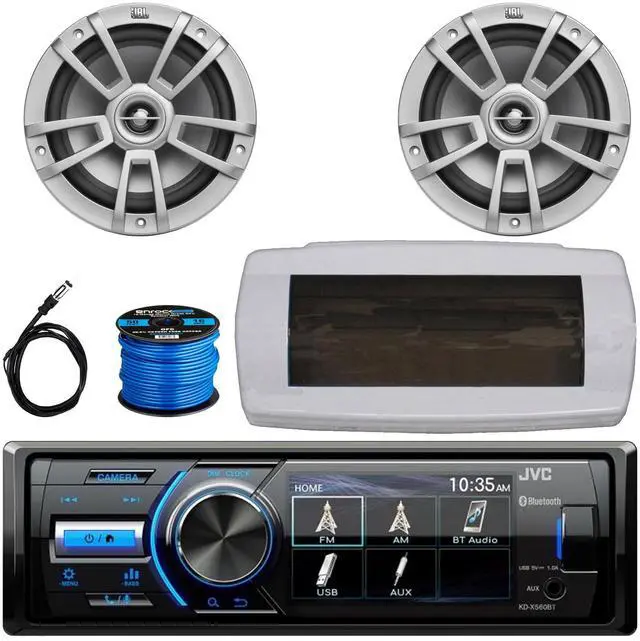 • PACKAGE BUNDLE INCLUDES: JVC KD-X560BT Single-DIN Marine Bluetooth USB/AUX MP3 AM/FM Radio Digital Media Stereo Receiver W/White Boat Stereo Splash Cover, 2x JBL Stage Marine 8" 375W Max Power High-Performance Boat Audio Gray Speakers, 50 Feet 16 Gauge Speaker Wire, 22" Radio Antenna
