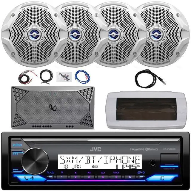 PACKAGE BUNDLE INCLUDES: JVC KD-X38MBS Single-DIN Marine Bluetooth USB/AUX LED Illumination AM/FM Radio SiriusXM Ready Stereo Receiver W/White Boat Stereo Splash Cover, 4x JBL 6.5" 180W Max Power Dual Cone Coaxial White Boat Speakers (Bulk Packaging), Infinity M704A 4-Channel Weather-Resistant High-Performance Compact Amplifier W/8-Gauge Amplifier Wiring Kit, 22" Radio Antenna