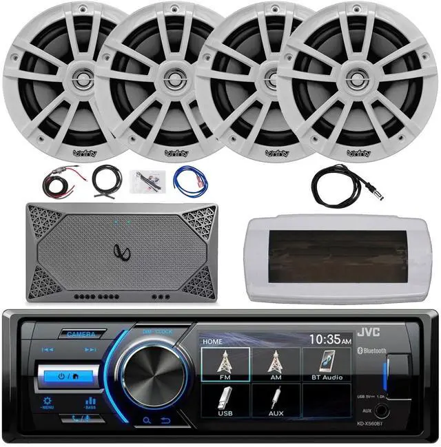 JVC KD-X560BT Single-DIN Marine Bluetooth USB/AUX MP3 AM/FM Radio Digital Media Stereo Receiver W/White Cover, 4x 6.5" 225W Max Power 2-Way White Boat Speakers, 4 Channel Amplifier W/Kit, 22" Antenna