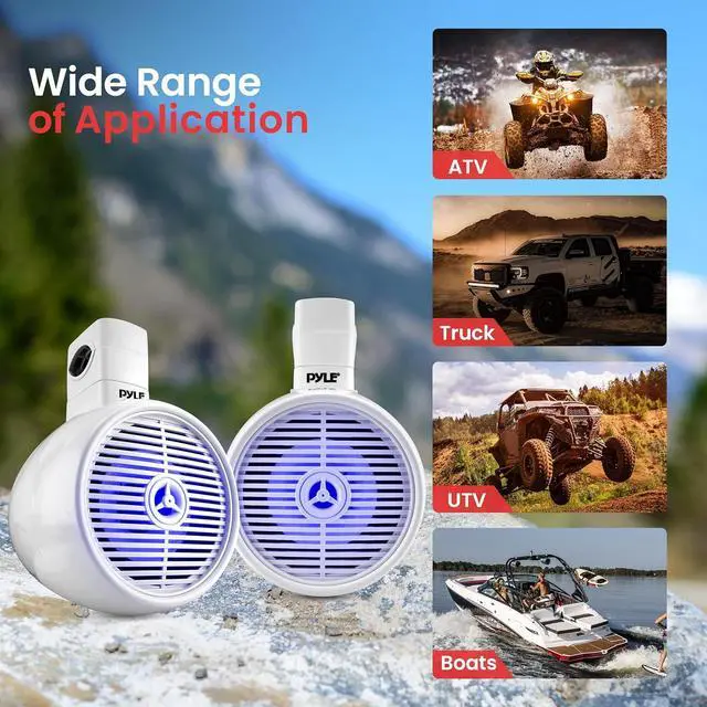 Enhance your outdoor adventures with the Pyle 8'' Marine Wakeboard Bluetooth Speaker System. Built for rugged environments, this water-resistant speaker features an 8-inch woofer, a 1-inch dome tweeter, and a 300-watt max power output, delivering premium sound quality. The built-in LED lights add a stylish touch to your marine or outdoor setup.
