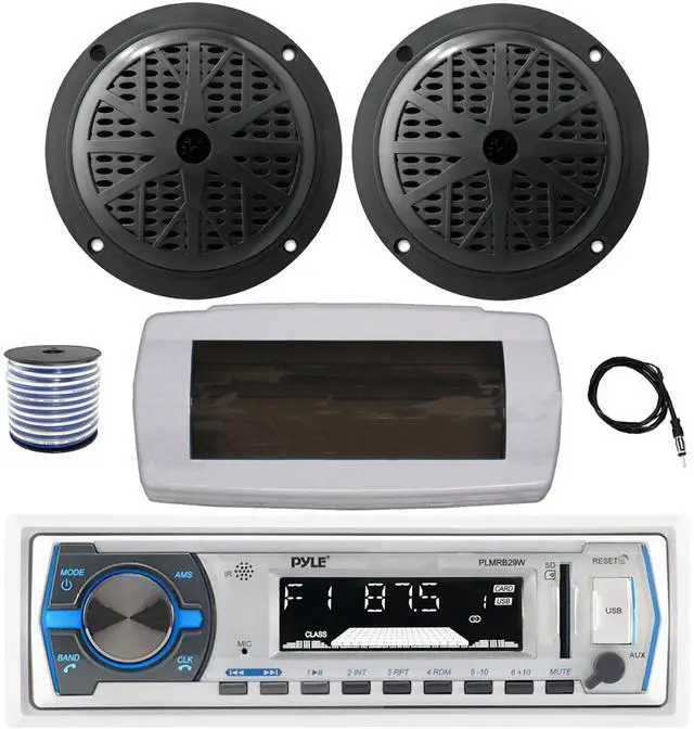 PACKAGE BUNDLE INCLUDES: Pyle PLMRB29W Single DIN Bluetooth Marine MP3 AM/FM Stereo Receiver with White Cover, 22" Radio Antenna, Wire, 2x 5.25" 100 Watt Peak Full Range Dual Cone Waterproof Stereo Speakers (Black) RECEIVER: 300W Power: Bluetooth Connectivity with Hands Free Calling: stream audio directly from your hand-held A2DP Bluetooth enabled device like iPhone, android, smartphones and play internet radio. Remote Control is Included.SPEAKERS: The Pyle PLMR51 5.25" dual-cone, full-range speaker is suitable for marine use. Designed with rust-proof mesh covers for quality protection with max power handling of 100 watts. The polypropylene cone accurately reproduces sound, and the molded ABS plastic basket keeps your sound distortion-free.