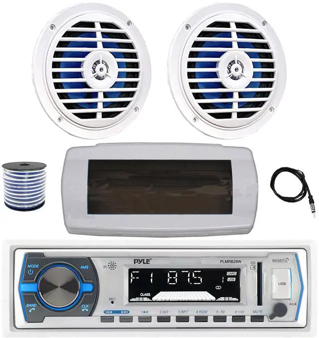 PACKAGE BUNDLE INCLUDES: Pyle PLMRB29W Single DIN Bluetooth Marine MP3 AM/FM Stereo Receiver with White Cover, 22" Radio Antenna, Wire, 2x 5.25'' 100 Watt Peak Full Range Dual Cone Waterproof Stereo Speakers (White) RECEIVER: 300W Power: Bluetooth Connectivity with Hands Free Calling: stream audio directly from your hand-held A2DP Bluetooth enabled device like iPhone, android, smartphones and play internet radio. Remote Control is Included.SPEAKERS: The PLMR57W is a pair of 100-watt, 5.25' two-way, full-range speaker suitable for marine use. This speaker is equipped with a polypropylene cone with cloth surround for accurate sound reproduction.