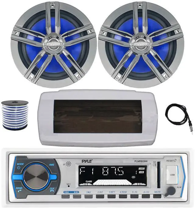 PACKAGE BUNDLE INCLUDES: Pyle PLMRB29W Single DIN Bluetooth Marine MP3 AM/FM Stereo Receiver with White Cover, 22" Radio Antenna, Wire, 2x 6.5" 180 Watt Max Power 2-Way Water Resistant Audio Speakers (Charcoal) RECEIVER: 300W Power: Bluetooth Connectivity with Hands Free Calling: stream audio directly from your hand-held A2DP Bluetooth enabled device like iPhone, android, smartphones and play internet radio. Remote Control is Included.SPEAKERS: The Enrock EM265 6.5 speakers features a weather-proof basket that resists deterioration from salt, moisture, and UV rays, while the non-removable grille will maintain its perfect, durable finish. The 1 tweeter offers high-frequency projections for crisp clear sound whether youre riding the waves or relaxing at shore.