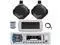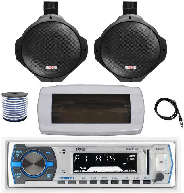 PACKAGE BUNDLE INCLUDES: Pyle PLMRB29W Single DIN Bluetooth Marine MP3 AM/FM Stereo Receiver with White Cover, 22" Radio Antenna, Wire, 2x 6.5" 200 Watt Peak Water Resistant Full Range Wakeboard Audio Speakers (Black) RECEIVER: 300W Power: Bluetooth Connectivity with Hands Free Calling: stream audio directly from your hand-held A2DP Bluetooth enabled device like iPhone, android, smartphones and play internet radio. Remote Control is Included.SPEAKERS: These 200-watt speakers are equipped with a 6.5' poly mica woofer cone for a booming low end and 1' polymer dome tweeter for sweet highs for a frequency response of 70 Hz to 20 kHz. Butyl rubber surround and heavy duty plastic cabinet construction extends the life of your product, and gold plated plug terminals keep your sound distortion-free. Mounting bracket included.