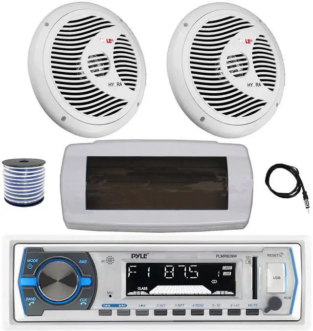 PACKAGE BUNDLE INCLUDES: Pyle PLMRB29W Single DIN Bluetooth Marine MP3 AM/FM Stereo Receiver with White Cover, 22" Radio Antenna, Wire, 2x 6.5" 150 Watt Max Full Range Dual Cone Waterproof Stereo Speakers (White) RECEIVER: 300W Power: Bluetooth Connectivity with Hands Free Calling: stream audio directly from your hand-held A2DP Bluetooth enabled device like iPhone, android, smartphones and play internet radio. Remote Control is Included.SPEAKERS: The Pyle 6.5'' Speakers are constructed with a design featuring a 20 Oz. circuit magnet for a full range audio, power output is 75 Watts RMS/150 Watts peak, frequency response of 80Hz-18Khz and 4 Ohms impedance.