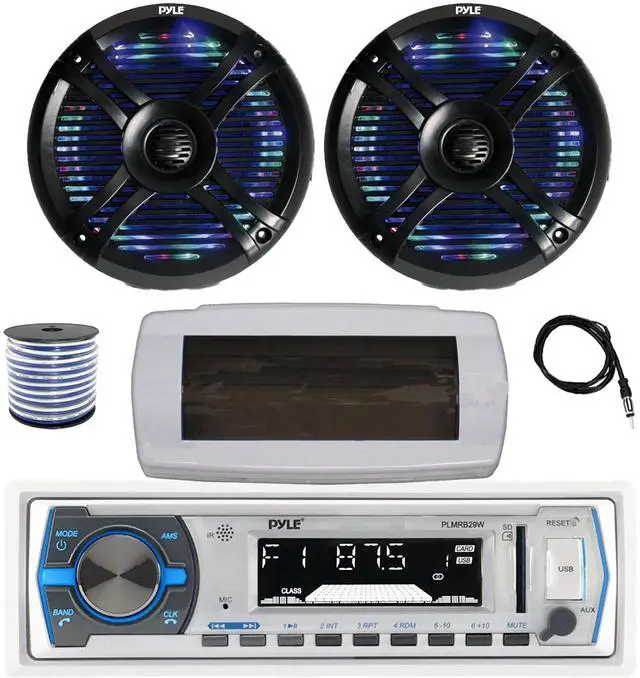 PACKAGE BUNDLE INCLUDES: Pyle PLMRB29W Single DIN Bluetooth Marine MP3 AM/FM Stereo Receiver with White Cover, 22" Radio Antenna, Wire, 2x 6.5" 250 Watt Max 2-Way Waterproof Multicolor LED Audio Speakers (Black) RECEIVER: 300W Power: Bluetooth Connectivity with Hands Free Calling: stream audio directly from your hand-held A2DP Bluetooth enabled device like iPhone, android, smartphones and play internet radio. Remote Control is Included.SPEAKERS: Pyle 6.5" speakers feature built-in multi-color LED lights with a remote control that allows you to program your lights -- making adjustments to dancing, flashing, color, brightness and speed modes. Additional features include 2-way stereo sound reproduction, 250 watt power output, rugged polypropylene cones and weather resistant ABS molded baskets.