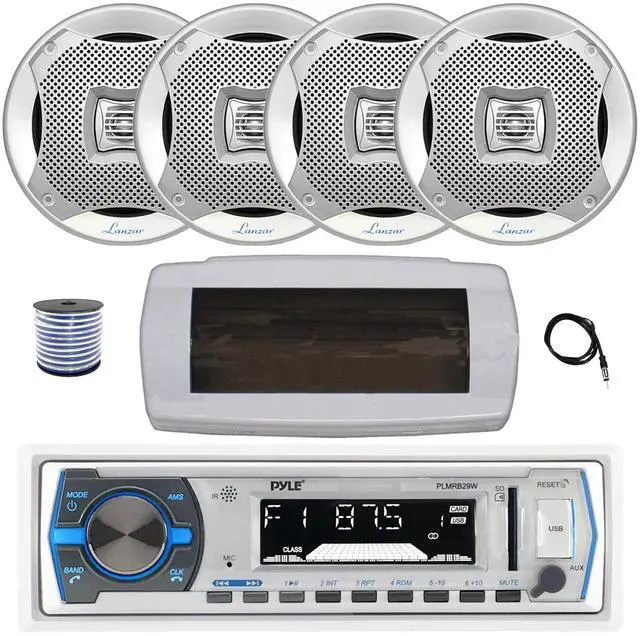 PACKAGE BUNDLE INCLUDES: Pyle PLMRB29W Single DIN Bluetooth Marine MP3 AM/FM Stereo Receiver with White Cover, 22" Radio Antenna, Wire, 4x 6.5" 400W Max 2-Way Water Resistant Audio Speakers (Silver) RECEIVER: 300W Power: Bluetooth Connectivity with Hands Free Calling: stream audio directly from your hand-held A2DP Bluetooth enabled device like iPhone, android, smartphones and play internet radio. Remote Control is Included.SPEAKERS: The Pyle AQ6CXS 6.5" full-range speakers are suitable for marine use. They're rated at 400Ws for big power. The 1' high temperature Kapton voice coil accurately reproduces low and mid-range frequencies, while the 0.5' superior dome tweeter hits the high frequencies. The molded ABS plastic basket keeps your sound distortion-free.