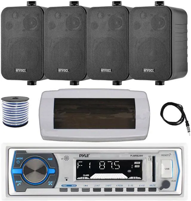 PACKAGE BUNDLE INCLUDES: Pyle PLMRB29W Single DIN Bluetooth Marine MP3 AM/FM Stereo Receiver with White Cover, 22" Radio Antenna, Wire, 4x 4" 30 Watt Peak Water-Resistant 3-Way InDoor/OutDoor Audio Speakers (Black) RECEIVER: 300W Power: Bluetooth Connectivity with Hands Free Calling: stream audio directly from your hand-held A2DP Bluetooth enabled device like iPhone, android, smartphones and play internet radio. Remote Control is Included.SPEAKERS: Enrock Audio 4" 30 Watt 3-Way Indoor/Outdoor Speakers are made extremely durable fully Marinized Weather Proof state-of-the-art waterproofing materials plus special UV coatings for plastic surfaces. Coated circuit boards and connections to protect the product against the harsh outdoor elements.