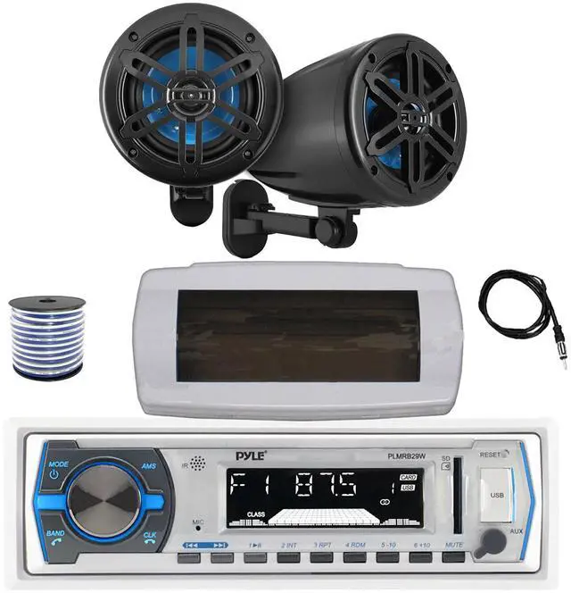 PACKAGE BUNDLE INCLUDES: Pyle PLMRB29W Single DIN Bluetooth Marine MP3 AM/FM Stereo Receiver with White Cover, 22" Radio Antenna, Wire, 2x 5.25" 180 Watt Max 2-Way Waterproof Off-Road Audio Speakers (Black) RECEIVER: 300W Power: Bluetooth Connectivity with Hands Free Calling: stream audio directly from your hand-held A2DP Bluetooth enabled device like iPhone, android, smartphones and play internet radio. Remote Control is Included.SPEAKERS: :Pyles 180W marine grade off-road speaker system is what you need to listen to high-quality audio on your motorcycle, ATV, 4x4, Jeep or other outdoor vehicles! Includes two 5.25" 2-way passive long excursion woofer off-road speakers