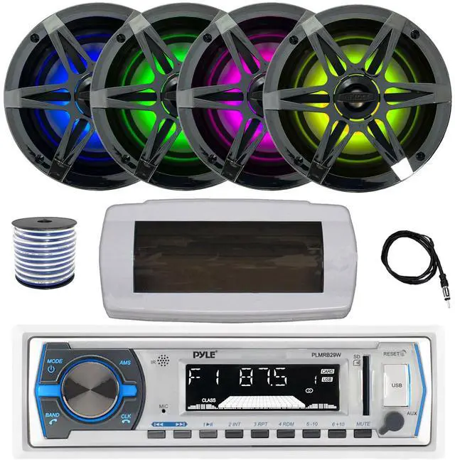 PACKAGE BUNDLE INCLUDES: Pyle PLMRB29W Single DIN Bluetooth Marine MP3 AM/FM Stereo Receiver with White Cover, 22" Radio Antenna, Wire, 4x 6.5" 120 Watt Peak Multicolor LED Boat Audio Speakers w/Chrome Grilles (Black) RECEIVER: 300W Power: Bluetooth Connectivity with Hands Free Calling: stream audio directly from your hand-held A2DP Bluetooth enabled device like iPhone, android, smartphones and play internet radio. Remote Control is Included.SPEAKERS: The 6.5" marine speakers with Chrome Grilles are designed specifically for boats and the outdoors with a MAX power of 120 watts and a RMS power of 60 watts. Equipped with removable multi-color LED accent lighting that can be changed to fit your mood or craft. The bold, stylish design comes packaged with easy-to-match grilles for a customized look that includes a smart, integrated moisture-draining system.