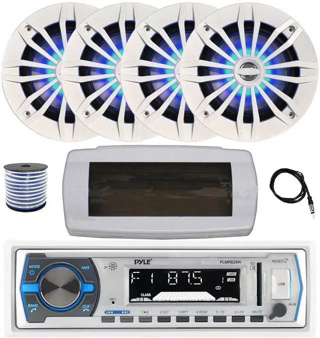 PACKAGE BUNDLE INCLUDES: Pyle PLMRB29W Single DIN Bluetooth Marine MP3 AM/FM Stereo Receiver with White Cover, 22" Radio Antenna, Wire, 4x 6.5" 180 Watt Peak 2-Way Blue Flashing LED Boat Audio Speakers (White) RECEIVER: 300W Power: Bluetooth Connectivity with Hands Free Calling: stream audio directly from your hand-held A2DP Bluetooth enabled device like iPhone, android, smartphones and play internet radio. Remote Control is Included.SPEAKERS: Enrock 6.5" 2-way marine speakers are designed to give you big, bold accurately-produced sound and style. These Enrock speakers have a blue hue to them. When listening to your favorite tunes the Blue LED Lighting will flash according to your beat.