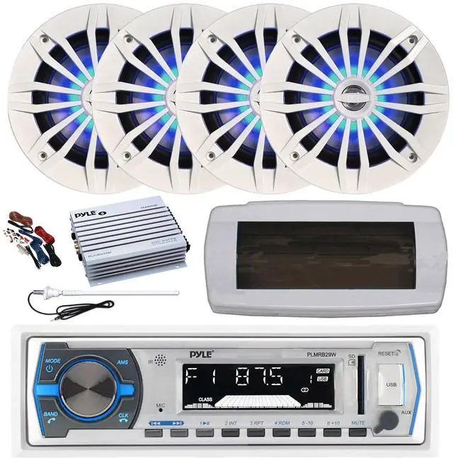 PACKAGE BUNDLE INCLUDES: Pyle PLMRB29W Single DIN Bluetooth Marine MP3 AM/FM Stereo Receiver with White Cover, Long Range Antenna, Amplifier w/Kit, 4x 6.5" 180 Watt Peak 2-Way Blue Flashing LED Boat Audio Speakers (White) RECEIVER: 300W Power: Bluetooth Connectivity with Hands Free Calling: stream audio directly from your hand-held A2DP Bluetooth enabled device like iPhone, android, smartphones and play internet radio. Remote Control is Included.SPEAKERS: Enrock 6.5" 2-way marine speakers are designed to give you big, bold accurately-produced sound and style. These Enrock speakers have a blue hue to them. When listening to your favorite tunes the Blue LED Lighting will flash according to your beat. AMPLIFIER: Pyles PLMRA400 is engineered as a 4 Channel marine amplifier that allows high quality stereo reproduction from source. This amplifier is powerful with its 100 WATT x 4 max or 400 WATT and dual MOFSET power supply