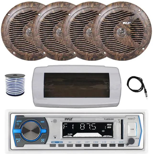 PACKAGE BUNDLE INCLUDES: Pyle PLMRB29W Single DIN Bluetooth Marine MP3 AM/FM Stereo Receiver with White Cover, 22" Radio Antenna, Wire, 4x 6.5" 150 Watt Max Full Range Dual Cone Waterproof Stereo Speakers (Camo) RECEIVER: 300W Power: Bluetooth Connectivity with Hands Free Calling: stream audio directly from your hand-held A2DP Bluetooth enabled device like iPhone, android, smartphones and play internet radio. Remote Control is Included.SPEAKERS: The Pyle 6.5'' Speakers are constructed with a design featuring a 20 Oz. circuit magnet for a full range audio, power output is 75 Watts RMS/150 Watts peak, frequency response of 80Hz-18Khz and 4 Ohms impedance.