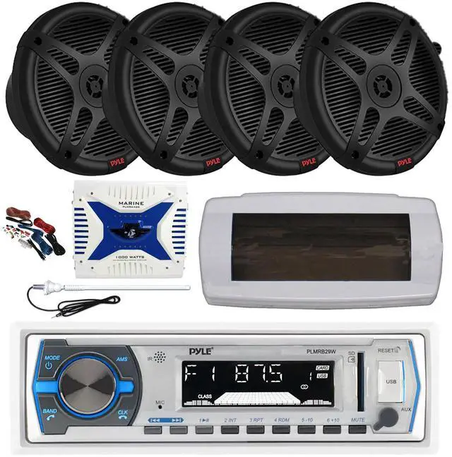 PACKAGE BUNDLE INCLUDES: Pyle PLMRB29W Single DIN Bluetooth Marine MP3 AM/FM Stereo Receiver, White Cover, Long Range Antenna, Amplifier w/Kit, 4x 6.5" 600 Watt Max 2-Way Waterproof Wireless RF Streaming Speakers (Black) RECEIVER: 300W Power: Bluetooth Connectivity with Hands Free Calling: stream audio directly from your hand-held A2DP Bluetooth enabled device like iPhone, android, smartphones and play internet radio. Remote Control is Included.SPEAKERS: : Pyle 6.5" 2-way Coaxial component speaker features full range stereo sound reproduction - Wireless radio frequency (RF) streaming support ability, IP-X4 rated weatherproof. Power output: 600 watt MAX. Used for marine & mobile vehicle applications for car, boat, off-road ATV, marine watercraftAMPLIFIER: Pyles PLMRA420 is engineered as a 4 Channel bridgeable marine amplifier that powers up your speaker and is universally compatible. It also has high and low electronic crossover network or pass filters. 1000 WATT maximum
