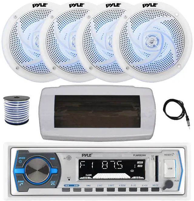 PACKAGE BUNDLE INCLUDES: Pyle PLMRB29W Single DIN Bluetooth Marine MP3 AM/FM Stereo Receiver with White Cover, 22" Radio Antenna, Wire, 4x 4" 100 Watt Max 2-Way Blue Flashing LED Boat Audio Speakers (White) RECEIVER: 300W Power: Bluetooth Connectivity with Hands Free Calling: stream audio directly from your hand-held A2DP Bluetooth enabled device like iPhone, android, smartphones and play internet radio. Remote Control is Included.SPEAKERS: Pyle 4" marine speakers are constructed with aluminum materials and other durable substances for a rugged sound system. The speakers are also waterproof to withstand water and weather resistant to combat sun damage. They even have LED lights for an added touch.