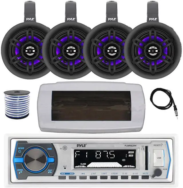 PACKAGE BUNDLE INCLUDES: Pyle PLMRB29W Single DIN Bluetooth Marine MP3 AM/FM Stereo Receiver with White Cover, 22" Radio Antenna, Wire, 4x 4" 300W Max Bluetooth Waterproof Wakeboard LED Tower Speakers (Black) RECEIVER: 300W Power: Bluetooth Connectivity with Hands Free Calling: stream audio directly from your hand-held A2DP Bluetooth enabled device like iPhone, android, smartphones and play internet radio. Remote Control is Included.SPEAKERS: Pyle PLMRLEWB47BB 4" 300W Max Power speakers feature bluetooth connectivity, built-in LED lights, waterproof and UV resistant. 1.0 titanium dome tweeter provides very natural sounding high frequency reproduction. The subwoofers have 70hz to 20kHz frequency response so you can ensure that your water recreation can have the tunes that it deserves