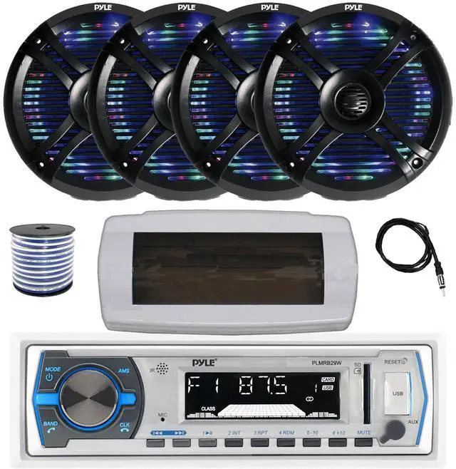 PACKAGE BUNDLE INCLUDES: Pyle PLMRB29W Single DIN Bluetooth Marine MP3 AM/FM Stereo Receiver with White Cover, 22" Radio Antenna, Wire, 4x 6.5" 250 Watt Max 2-Way Waterproof Multicolor LED Audio Speakers (Black) RECEIVER: 300W Power: Bluetooth Connectivity with Hands Free Calling: stream audio directly from your hand-held A2DP Bluetooth enabled device like iPhone, android, smartphones and play internet radio. Remote Control is Included.SPEAKERS: Pyle 6.5" speakers feature built-in multi-color LED lights with a remote control that allows you to program your lights -- making adjustments to dancing, flashing, color, brightness and speed modes. Additional features include 2-way stereo sound reproduction, 250 watt power output, rugged polypropylene cones and weather resistant ABS molded baskets.