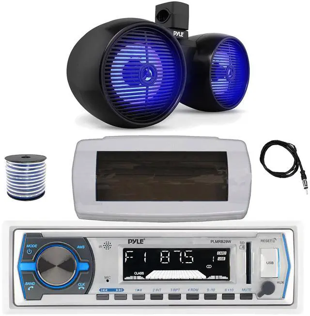 PACKAGE BUNDLE INCLUDES: Pyle PLMRB29W Single DIN Bluetooth Marine MP3 AM/FM Stereo Receiver with White Cover, 22" Radio Antenna, Wire, 1x 8" 300W Max 2-Way Full Range Wakeboard Built-in-LED Dual Audio Speakers (Black)