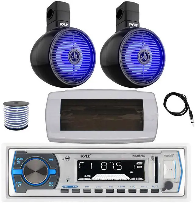PACKAGE BUNDLE INCLUDES: Pyle PLMRB29W Single DIN Bluetooth Marine MP3 AM/FM Stereo Receiver with White Cover, 22" Radio Antenna, Wire, 2x 8" 300W Max 2-Way Full Range Wakeboard Built-in-LED Single Audio Speakers (Black)