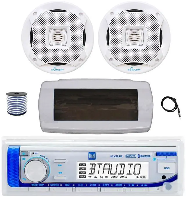 PACKAGE BUNDLE INCLUDES: Dual MXD13 Single DIN Bluetooth Marine MP3 AM/FM Stereo Receiver with White Cover, 22" Radio Antenna, Wire, 2x 5.25" 400W Max 2-Way Water Resistant Audio Speakers (White) RECEIVER: 200W Power: Let the music flow while you stay afloat with this 12v marine radio receiver by Pyle. It features 200W (50W x 4) peak power output and EQ configuration so you can control the bass, treble, balance, fader for a high quality sound. SPEAKERS: Pyle 5.25" speakers produce 200 Watt max power each, 400W power in total. Each speaker also contains 1" high-temperature voice coil, high-quality polypropylene cone to accurately reproduce low, mid-range, and high frequency sounds, water resistant and coated with resin treatment. Constructed with high quality polypropylene dual cone.