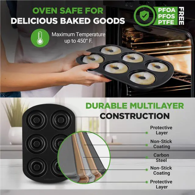 The well-designed holes give a fuller shape and a softer texture. Say goodbye to unevenly baked pastries and hello to mouthwatering delights every time. DONUT PANS FOR BAKING - Made from carbon steel, these pans ensure even heat distribution for perfect baking every time. They resist warping and bending, for consistent and beautiful results. Enjoy professional baking with easy-to-use pans. HEALTHIER BAKING OPTION - These PFOA, PFOS, and PTFE-free donut pans offer healthier and cleaner baking. They have a non-corrosive and stain-resistant surface, so your food remains free from harsh additives, and you can enjoy guilt-free treats with your loved ones.