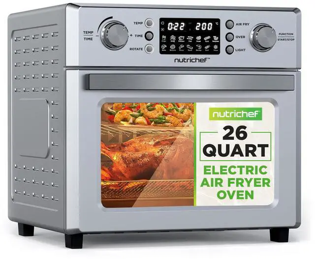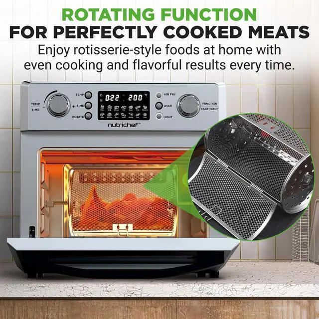 POWERFUL 1700W PERFORMANCE - Unleash culinary creativity with our 26L Electric Air Fryer Oven with Rotating Function. The robust 1700W heating element ensures rapid cooking, while the 26L capacity caters to your family's diverse cravings. 10 PRESET COOKING OPTIONS - Elevate your cooking game effortlessly. Benefit from 10 digital presets covering Air Fry, Toast, Bake, Broil, Roast, Reheat, Warm, Slow Cook, & Dehydrate. The high-definition LED touch screen simplifies precision cooking. EFFICIENT 360° HOT AIR CIRCULATION - Master the art of healthy and flavorful meals.