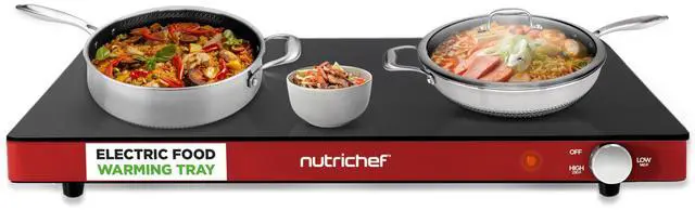 HEATING TRAY PERFECTION - This heating tray keeps meals deliciously warm with adjustable temperature control, making it perfect for any gathering. Energy-efficient and ensures your food stays at the ideal temperature. COOL-TOUCH CARRY HANDLES - With its easy-to-use rotary control and large surface area, this warming tray electric simplifies meal prep for any event. Its ultra-thin, space-saving design, and cool-touch carry handles offer both style and functionality. OVERHEAT PROTECTION AND NON-SLIP FEATURE - This electric heating tray features overheat protection and non-slip feet, ensuring safe operation on any countertop. Its intuitive controls and even heat distribution guarantee a safe warming experience.