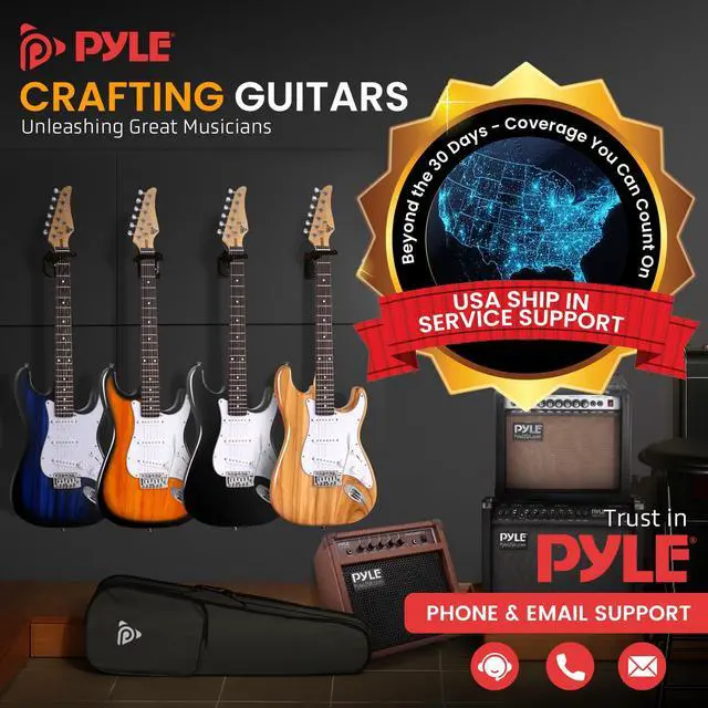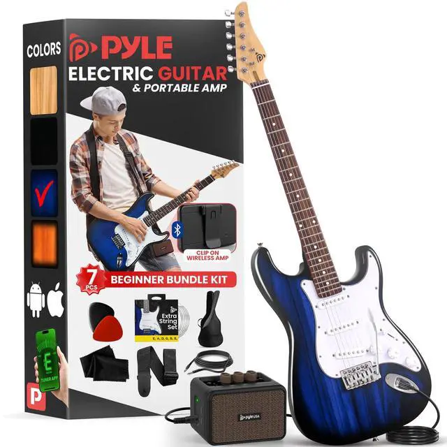 • Pyle Full Size Electric Guitar Kit with 5W Amplifier, Gig Bag, Picks, Spare Strings, and Strap, ST-Style Beginner Guitar Bundle with 22 Frets, Paulownia Wood Body, Blue