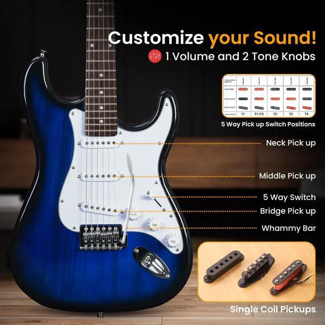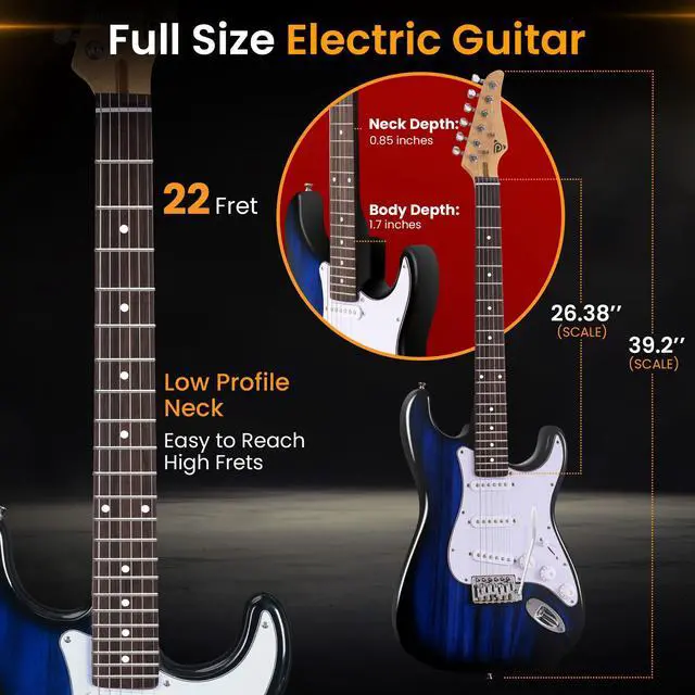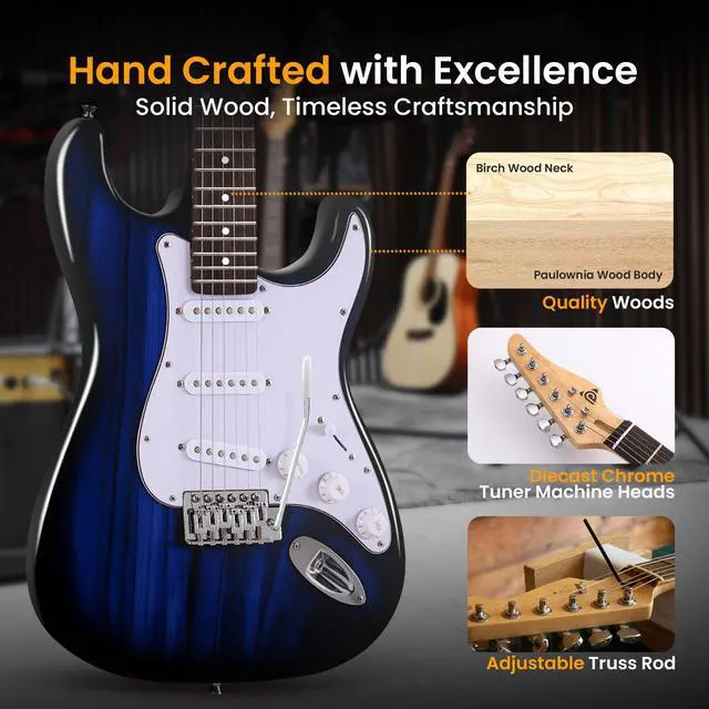 COMPLETE GUITAR KIT FOR BEGINNERS - This all-in-one electric guitar kit includes everything a beginner needs: a full-size 6-string guitar, a 5W amplifier, a gig bag, spare strings, a shoulder strap, and six picks. Perfect for beginners and advanced. PORTABLE 5W AMPLIFIER WITH HEADPHONE OUTPUT - The lightweight, portable 5W amplifier offers great clear and crisp sound. Features a drive switch, volume, treble, and bass controls, plus a headphone output for silent practice sessions. HIGH-QUALITY CRAFTSMANSHIP AND DESIGN - Made from premium materials including a Paulownia wood body and a Birch neck, this guitar offers durability, playability, and a sleek high-gloss finish, making it perfect for players of all levels. EASY TO TUNE AND ADJUST - The 22-fret guitar includes die-cast chrome machine heads for smooth, precise tuning. Rotary volume and tone controls allow easy customization, letting you find your perfect sound with ease. CLASSIC ST-STYLE DESIGN - Featuring a classic ST-style design, this guitar combines vintage looks with modern features. Chrome-accented hardware, a comfortable neck, and ergonomic body shape make it ideal for both practice and performance.