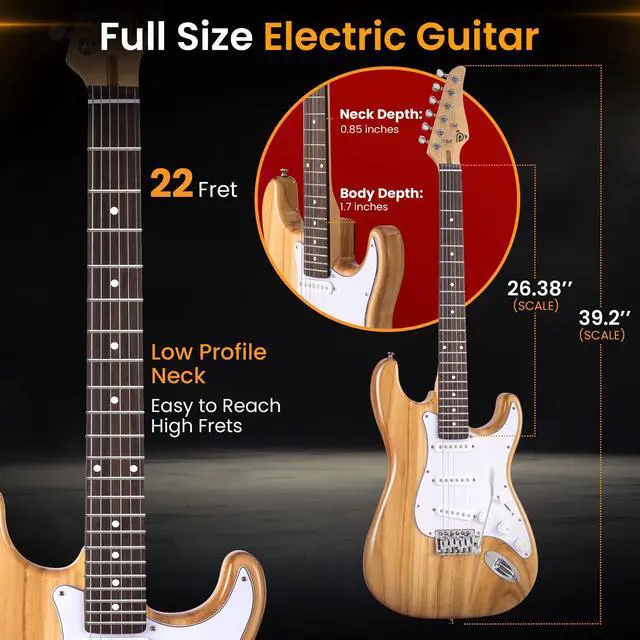 • Pyle Full Size Electric Guitar Kit with 5W Amplifier, Gig Bag, Picks, Spare Strings, and Strap, ST-Style Beginner Guitar Bundle with 22 Frets, Paulownia Wood Body, Natural