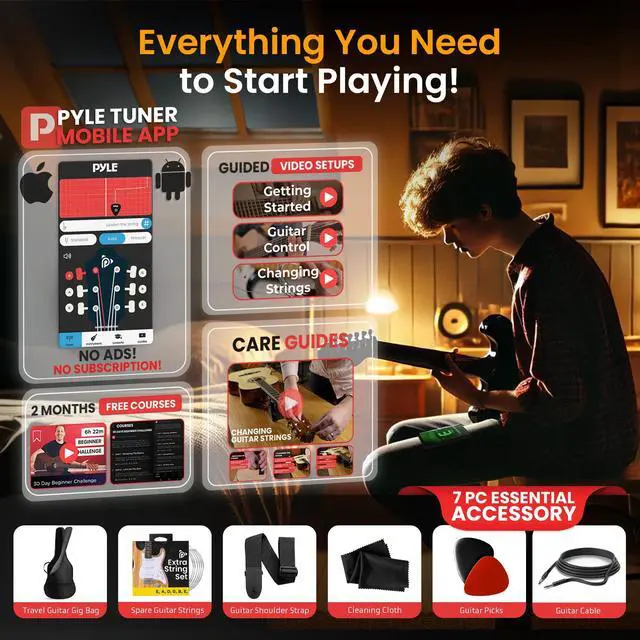COMPLETE GUITAR KIT FOR BEGINNERS - This all-in-one electric guitar kit includes everything a beginner needs: a full-size 6-string guitar, a 5W amplifier, a gig bag, spare strings, a shoulder strap, and six picks. Perfect for beginners and advanced. PORTABLE 5W AMPLIFIER WITH HEADPHONE OUTPUT - The lightweight, portable 5W amplifier offers great clear and crisp sound. Features a drive switch, volume, treble, and bass controls, plus a headphone output for silent practice sessions. HIGH-QUALITY CRAFTSMANSHIP AND DESIGN - Made from premium materials including a Paulownia wood body and a Birch neck, this guitar offers durability, playability, and a sleek high-gloss finish, making it perfect for players of all levels. EASY TO TUNE AND ADJUST - The 22-fret guitar includes die-cast chrome machine heads for smooth, precise tuning. Rotary volume and tone controls allow easy customization, letting you find your perfect sound with ease. CLASSIC ST-STYLE DESIGN - Featuring a classic ST-style design, this guitar combines vintage looks with modern features. Chrome-accented hardware, a comfortable neck, and ergonomic body shape make it ideal for both practice and performance.