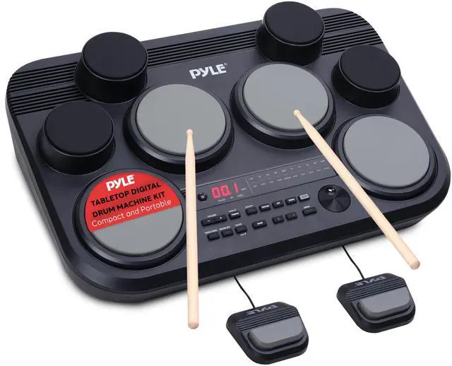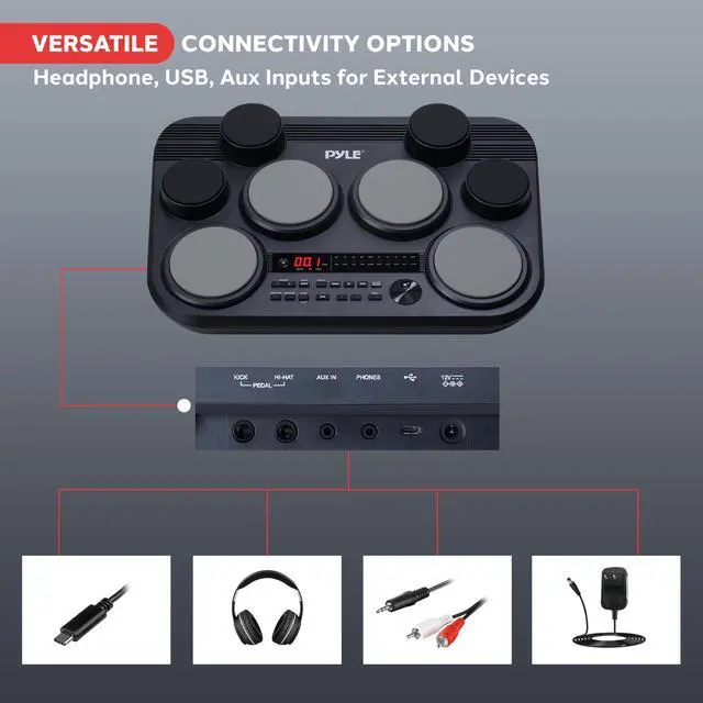 It includes 80 audio drum kits, 1 demo song, and space for 5 user-defined songs, offering a broad range of audio possibilities. VERSATILE DRUM KIT CONNECTIONS - Equipped with headphone and USB outputs, this drum kit lets you connect and stream audio from external devices. USB-C port doubles as MIDI in/out, with auxiliary input for added versatility. COMPACT & PORTABLE DESIGN - This electronic drum kit boasts a compact, tabletop design with a 3-digit LED control display. Features include a drum off practice mode, MIDI recording capability, and an adjustable tempo range from 30-280 BPM.