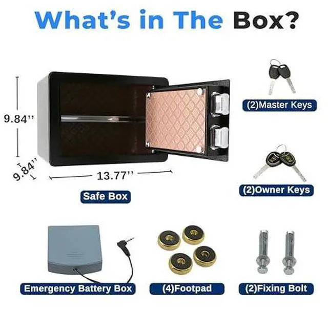 EFFICIENT ORGANIZATION - This safe box has a removable shelf for easy organization of items. Key holders for 5 keys on the back of the door keep your keys accessible, while the internal LED lights make it easy to find items in low light conditions. FULLY ASSEMBLED - The electronic safe box comes fully assembled with all necessary components: an emergency battery box, footpad, fixing bolt, 4 AA batteries, 2 owner keys, and 2 master keys. Perfect for secure storage in home, office, or business.