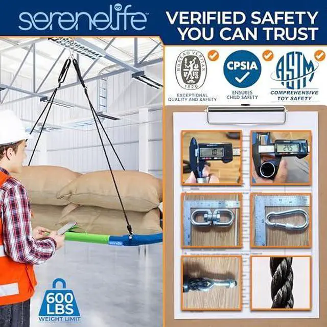 HANG KIT INCLUDED: The box includes a convenient carry bag for the hang kit, ensuring easy transport and storage. Complete with adjustable swing ropes, polyester straps, and stainless steel spinners, setting up your saucer swing is hassle-free. SUPPORTS UP TO 700