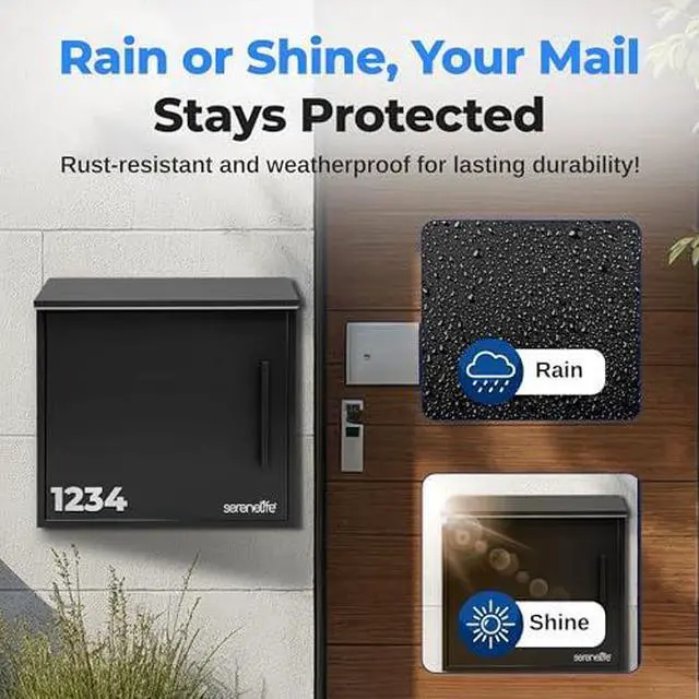 SECURE MAIL FEATURE - Elevate the safety of your correspondence with our locking mailbox, meticulously crafted from heavy-duty galvanized steel. The reliable locking mechanism comes with 2 keys, safeguarding against unauthorized access and privacy. EFFORTLESS MAIL INSERTION - Tailored for your convenience, this wall mailbox boasts an easy-access metal flap, making mail deposit hassle-free. Its design caters to both residential and commercial purposes, streamlining your daily mail management. SUPERIOR WEATHER RESISTANCE - Constructed to endure the elements, our mailbox features a robust, powder-coated finish. This weather-resistant design ensures longevity and performance, ensuring your mail stays dry and intact.
