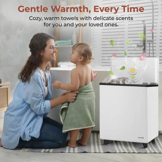 COOL: The towel heaters double-walled insulated lid retains heat efficiently while staying cool to the touch. Its hands-free design makes filling and emptying effortless, enhancing convenience and energy conservation.