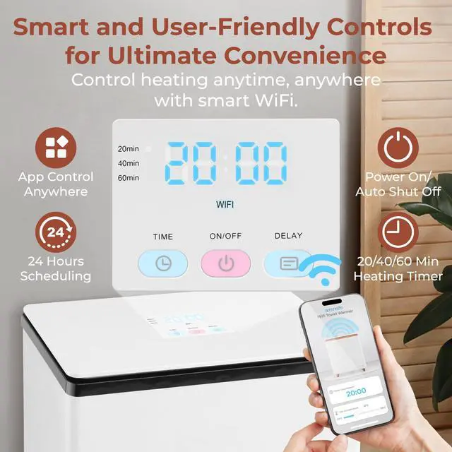 WI-FI CONTROLLED FOR CONVENIENCE: Easily connect the towel warmer to your home WiFi and control it remotely with your mobile phone. Schedule on/off times for hassle-free comfort, ensuring warm towels and blankets are always ready when you need them.