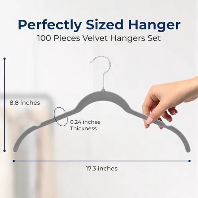 Dimensions: 17.32 x 8.86 x 0.2. Each hanger holds up to 8 lbs., making them perfect for heavier garments like coats. PERFECT GIFT FOR ORGANIZATION - This set of 100 velvet hangers transforms your wardrobe with an elegant grey finish and non-slip coating. This hanger set is also a thoughtful gift for housewarming parties or anyone looking to organize their closet.