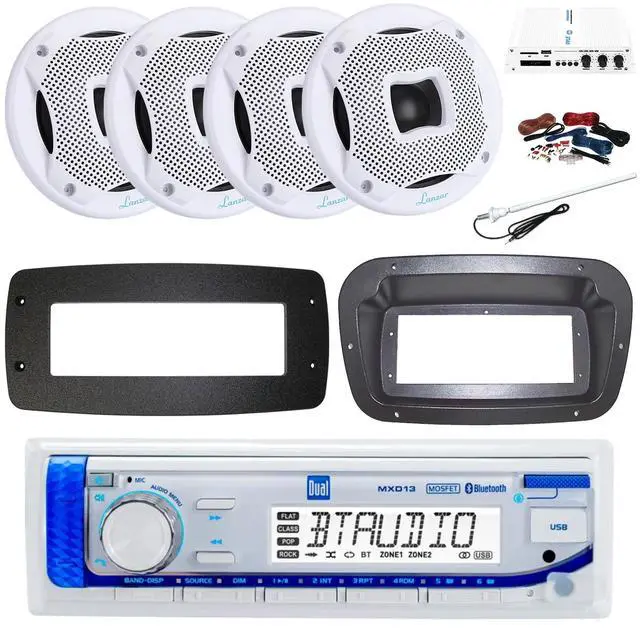 Dual MXD13 Single DIN Bluetooth Marine MP3 AM/FM Stereo Receiver, Spa bezel, Adapter Plate, 22" Radio Antenna, Wire, 4x 6.5" 400W Max 2-Way Water Resistant Audio Speakers (White)