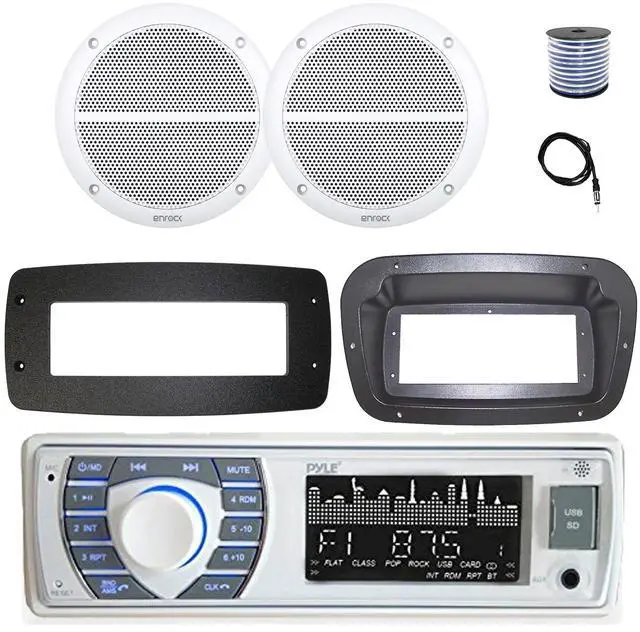 PACKAGE BUNDLE INCLUDES: Pyle PLRMR23BTW Single DIN Bluetooth Marine MP3 Stereo Receiver, Spa bezel, Adapter Plate, 22" Radio Antenna, Wire, 2x 6.5" 180 Watt Peak 2-Way Blue Flashing LED Boat Audio Speakers (White) Spa Bezel DOES NOT INCLUDE INSTALL SCREWS