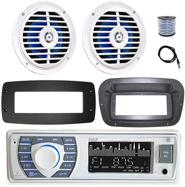 Pyle PLRMR23BTW Single DIN Bluetooth Marine MP3 Stereo Receiver, Spa bezel, Adapter Plate, 22" Radio Antenna, Wire, 2x 6.5'' 400W Peak 2-Way Full Range Dual Cone Waterproof Stereo Speakers (White)