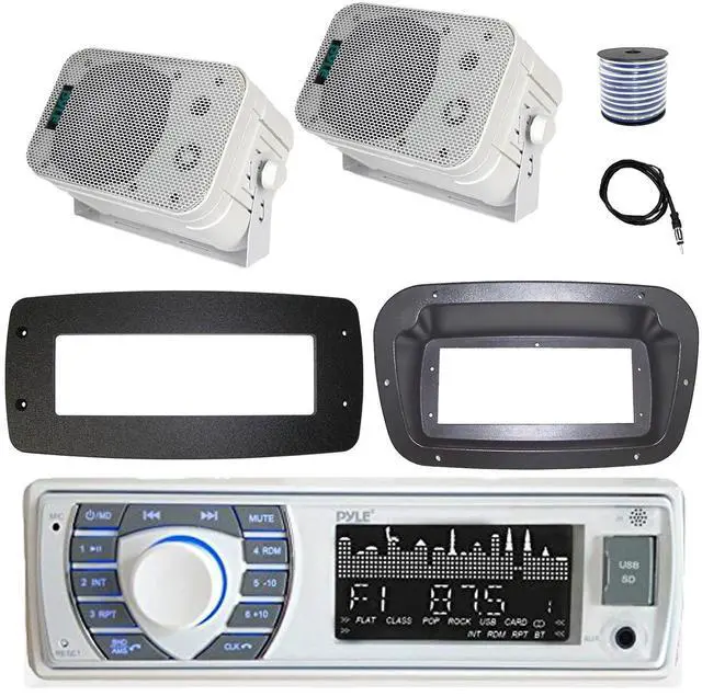 PACKAGE BUNDLE INCLUDES: Pyle PLRMR23BTW Single DIN Bluetooth Marine MP3 Stereo Receiver, Spa bezel, Adapter Plate, Radio Antenna, Wire, 2x 5.25" 600 Watt Max Power Bluetooth Indoor/Outdoor Waterproof Audio Speakers (White) Spa Bezel DOES NOT INCLUDE INSTALL SCREWS