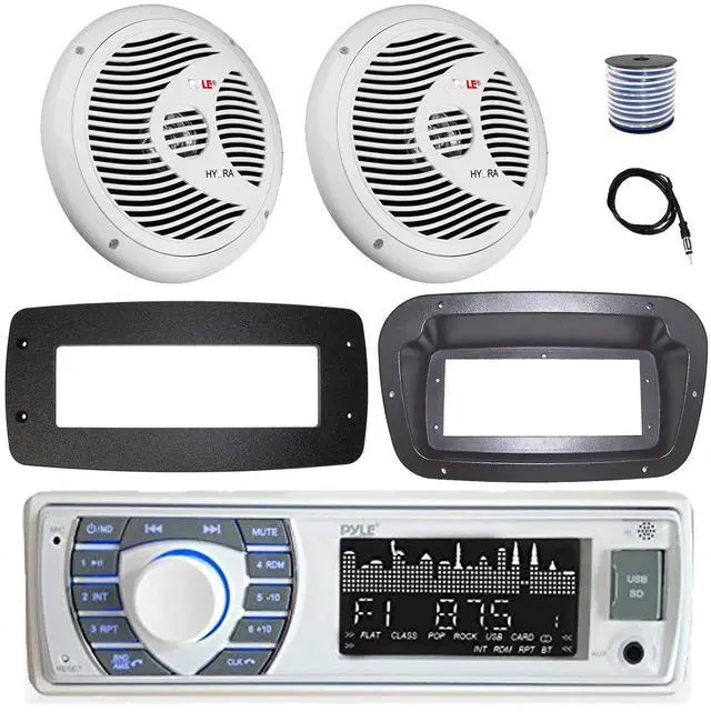 Pyle PLRMR23BTW Single DIN Bluetooth Marine MP3 Stereo Receiver, Spa bezel, Adapter Plate, 22" Radio Antenna, Wire, 2x 6.5" 120 Watt Peak Full Range Dual Cone Waterproof Stereo Speakers (White)