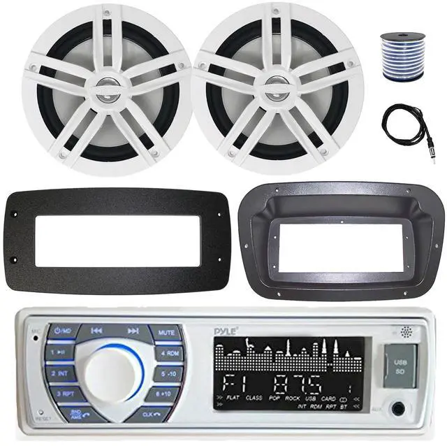 Pyle PLRMR23BTW Single DIN Bluetooth Marine MP3 Stereo Receiver, Spa bezel, Adapter Plate, 22" Radio Antenna, Wire, 2x 6.5" 180 Watt Max Power 2-Way Water Resistant Audio Speakers (White)