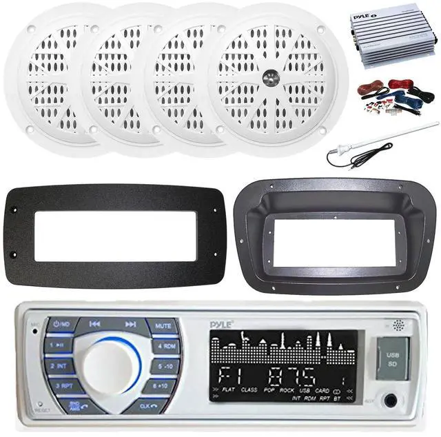 PACKAGE BUNDLE INCLUDES: Pyle PLRMR23BTW Single DIN Bluetooth Marine MP3 Stereo Receiver, Spa bezel, Adapter Plate, 22" Radio Antenna, Wire, 4x 5.25'' 100 Watt Peak Full Range Dual Cone Waterproof Stereo Speakers (White) Spa Bezel DOES NOT INCLUDE INSTALL SCREWS