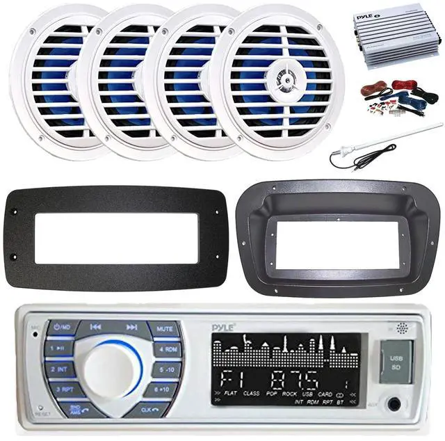 PACKAGE BUNDLE INCLUDES: Pyle PLRMR23BTW Single DIN Bluetooth Marine MP3 Stereo Receiver, Spa bezel, Adapter Plate, 22" Radio Antenna, Wire, 4x 6.5'' 400W Peak 2-Way Full Range Dual Cone Waterproof Stereo Speakers (White) Spa Bezel DOES NOT INCLUDE INSTALL SCREWS