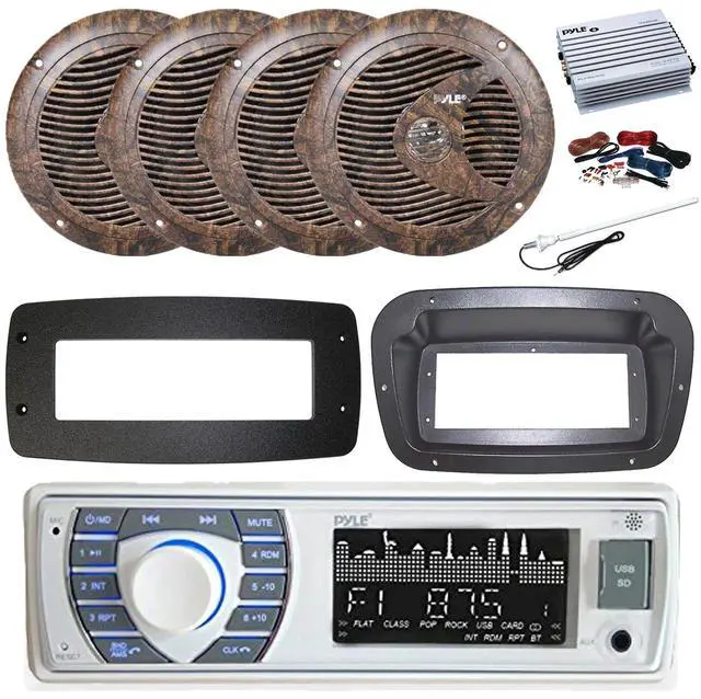 Pyle PLRMR23BTW Single DIN Bluetooth Marine MP3 Stereo Receiver, Spa bezel, Adapter Plate, 22" Radio Antenna, Wire, 4x 6.5" 150 Watt Max Full Range Dual Cone Waterproof Stereo Speakers (White)