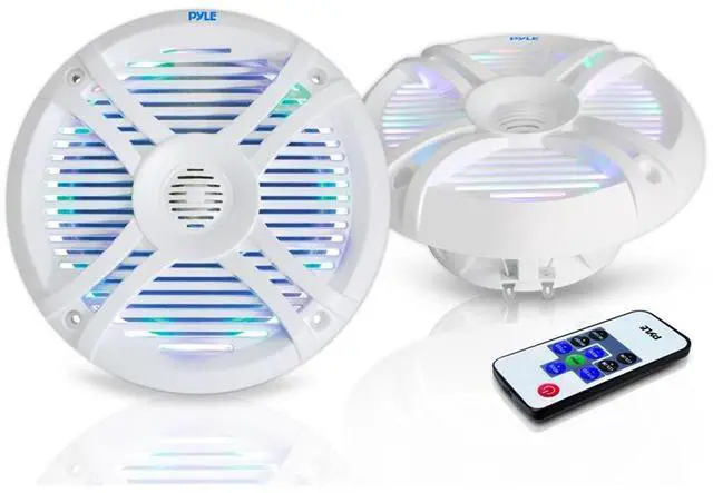 Pyle PLRMR23BTW Single DIN Bluetooth Marine MP3 Stereo Receiver, Spa bezel, Adapter Plate, 22" Radio Antenna, Wire, 4x 6.5" 250 Watt Max 2-Way Waterproof Multicolor LED Audio Speakers (White)