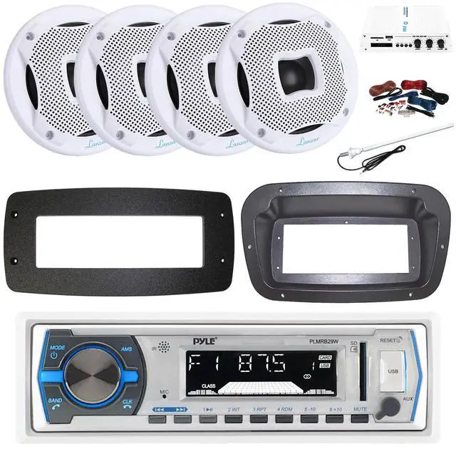 Pyle PLMRB29W Single DIN Bluetooth Marine MP3 Stereo Receiver, Spa bezel, Adapter Plate, 22" Radio Antenna, Wire, 4x 6.5" 400W Max 2-Way Water Resistant Audio Speakers (White)